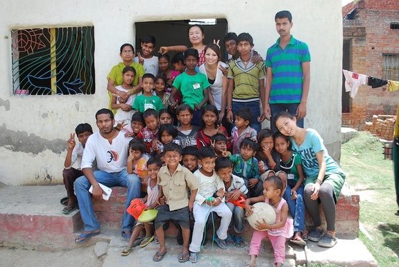 (学校の子どもたち、インド人教員、インド人ボランティア、日本人現地スタッフ、日本人ボランティアと共に)